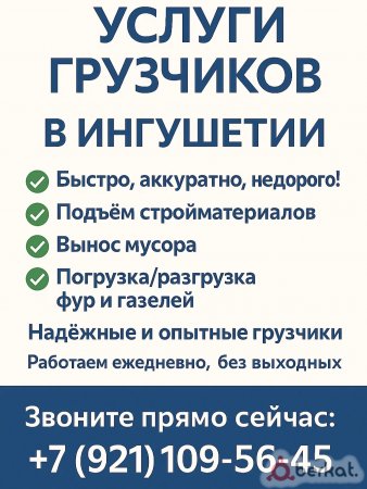 Услуги Грузчиков в Ингушетии Быстро, аккуратно, недорого! ✅ Переезды квартир и офисов ✅ Подъём стройматериалов ✅ Вынос мусора ✅ Погрузка/разгрузка фур и газелей Надёжные и опытные грузчики Есть газель при необходимости Работаем ежедневно, без выходных Звоните/пишите прямо сейчас: +7 (921) 109-56-45
