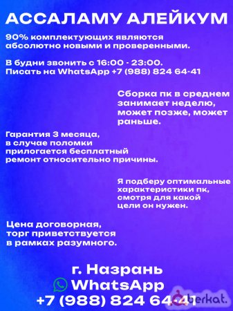 Ассаламу Алейкум. Собираю пк на заказ от 10000 рублей.Более подробная информация на фото. Называете сумму, после чего вы узнаете с какими характеристиками получится собрать пк. По предоплате. Обращаться в вацап по номеру + 7 (988) 824 64-41