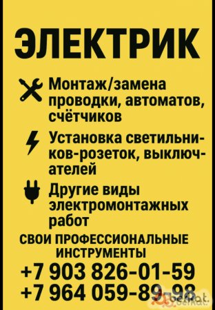 Электрик — любые сложности! ⚡ ✅ Свои профессиональные инструменты ✅ Гарантия на выполненные работы ✅ Честные цены, без накруток ✅ Ответственный и аккуратный подход Что делаю: ✅ Замена и ремонт проводки (квартиры, дома, офисы) ✅ Установка розеток, выключателей, светильников ✅ Быстро найду и устраню любые неполадки (нет света, выбивает автомат, греется проводка) ✅ Сборка и подключение электрощитов «под ключ»