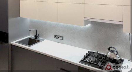 Кладём кафель, ламинат. Сборка и установка мебели. Клеем гибкий мрамор на стены. Делаем также отдельные вырезы столешницы под мойку, газовую плиту. ( установка и подключение)