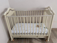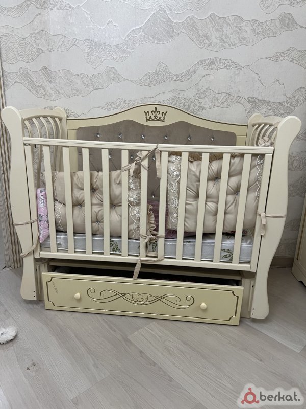 Как на фото, только бежевая, с рисунком короны спереди. Не успела сфотографировать до разбора. Небольшие царапины, можно покрасить. Брала за 21000 рублей. В комплекте бортики-подушечки ажурные бежевые и белые, очень нежные. Матрас овальный ортопедический.