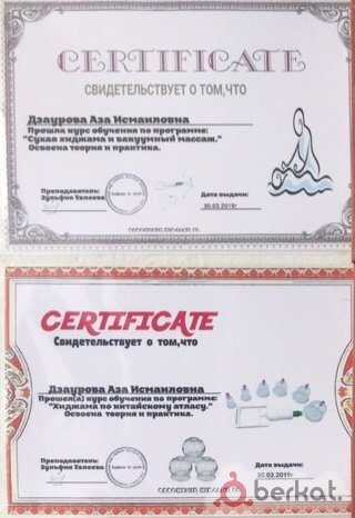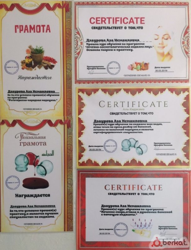 Высококвалифицированный специалист с медицинским стажем 40 лет оказывает услуги: Гирудотерапия/лечение пиявками (в том числе - бесплодия), продажа пиявок. Хиджама, а также капельницы, внутривенные и внутримышечные инъекции и массаж: лечебный массаж, детский, спортивный, антицеллюлитный, корректирующий и т.д. Возможен выезд на дом. Медицинское образование, огромный стаж, повышение квалификации, специализации по гирудотерапии (пиявки), хиджаме и массажу, все это подтверждено дипломами, сертификатами, свидетельствами, грамотами, трудовой книжкой, которые вы можете увидеть в чистом и уютном кабинете, находящемся по улице Осканова, рядом со Сбербанком и Гимназией г. Назрань. В ватсапе не всегда