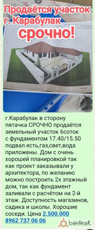 В городе Карабулак в сторону пятачка продаётся земельный участок 6 соток с большим фундаментом проект на руках все документы есть цена 2. 500 минимальный торг. обращаться по этому номеру 8 (962) 737-06-06.