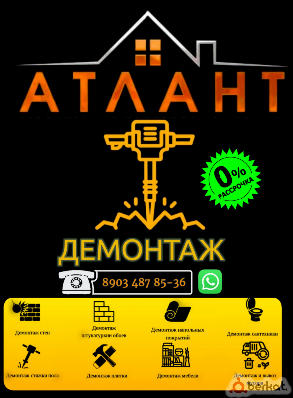 Фирма:АТЛАНТ Уважаемые клиенты! Наша профессиональная бригада занимается : Демонтаж ветхих домов ✅ Демонтаж ветхого строения ✅ Демонтаж фундамента ✅ Демонтаж ветхих построек, навесов и т.д —————————————— ❗️Опытная ручная бригада со всем необходимым инструментом. ❗️Каждый объект курирует опытный бригадир от начала до конца! ❗️ Работаем без предоплаты и посредников! —————————————— Как определяется цена за демонтаж? ◾️Бригадир выезжает на объект , делает оценку работы и говорит цену клиенту. (Оценка работы бесплатно по г.Магас-Назрань) ◾️ Либо клиент присылает на ватсап видео/фото предстоящей работы. ◾️Работаем без выходных по всей РИ Так же имеется рассрочка без % все с соответствии с Шариатом