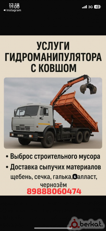 Предлагаю Услуги Манипулятора с ковшом,а так же вывозим строительный мусор и. т. д, а так же везём песок, щебень, чернозём, заполняем фундамент. Не надо нанимать трактор и камаз, я на себя гружу с ковшом и выбрасываю