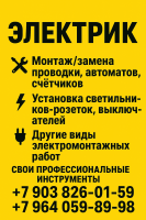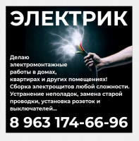 Выполняю все виды электромонтажных работ, устранение неисправностей проводки и замыканий, монтаж и демонтаж проводки, установка уличных фонарей, протягивание 380 или 220 вольт, установка щитка и розеток, люстров, укладка тёплого пола и подключение, и многое другое, качественно и быстро Телефон: +7(928)097-94-94