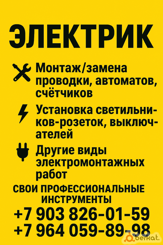 Электрик — любые сложности! ⚡ ✅ Свои профессиональные инструменты ✅ Гарантия на выполненные работы ✅ Честные цены, без накруток ✅ Ответственный и аккуратный подход Что делаю: ✅ Замена и ремонт проводки (квартиры, дома, офисы) ✅ Установка розеток, выключателей, светильников ✅ Быстро найду и устраню любые неполадки (нет света, выбивает автомат, греется проводка) ✅ Сборка и подключение электрощитов «под ключ»