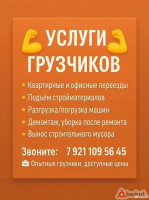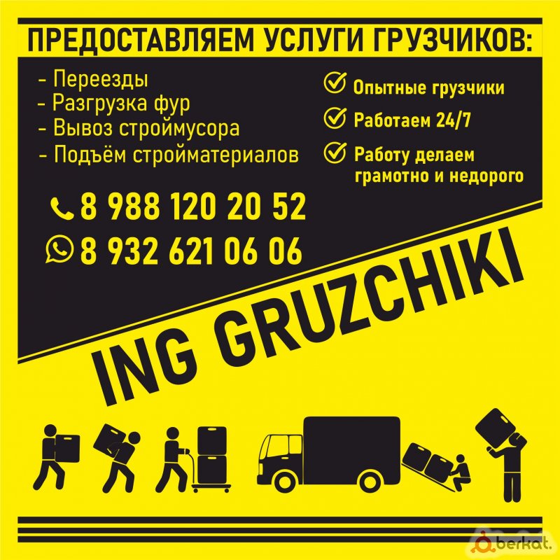 Предоставляем услуги грузчиков и грузоперевозок: переезды (квартирно-офисные, домашние); подъем и спуск мебели, стройматериалов; вывоз строительного мусора. Доставим ваш груз и сделаем работу качественно, надежно и своевременно. Связаться с нами: +7938 158 06 06 WhatsApp: +7938 158 06 06