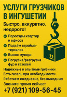 Услуги Грузчиков в Ингушетии Быстро, аккуратно, недорого! ✅ Переезды квартир и офисов ✅ Подъём стройматериалов ✅ Вынос мусора ✅ Погрузка/разгрузка фур и газелей Надёжные и опытные грузчики Есть газель при необходимости Работаем ежедневно, без выходных Звоните/пишите прямо сейчас: +7 (921) 109-56-45